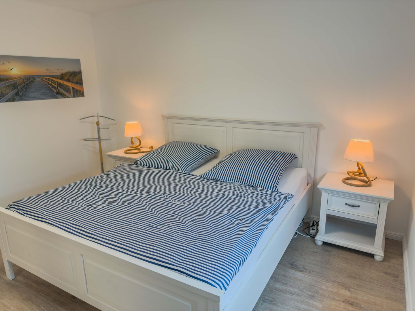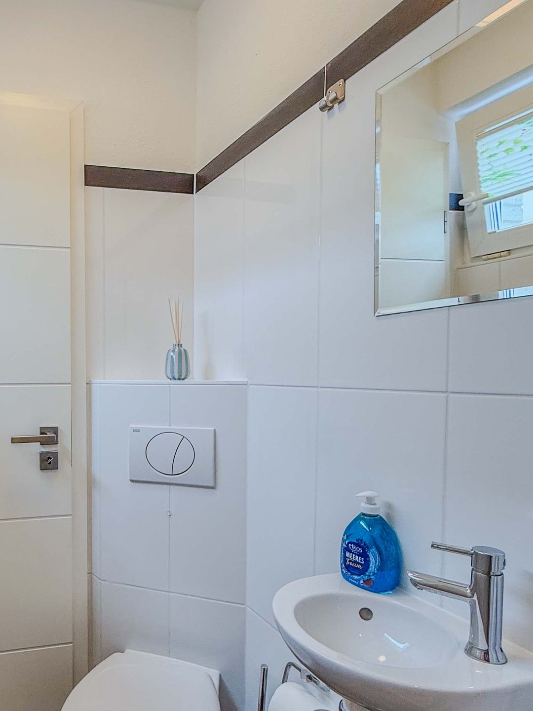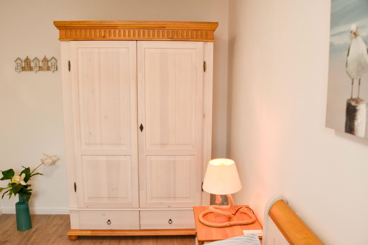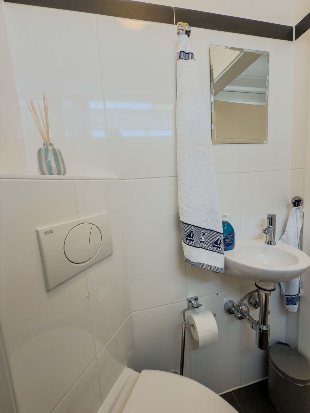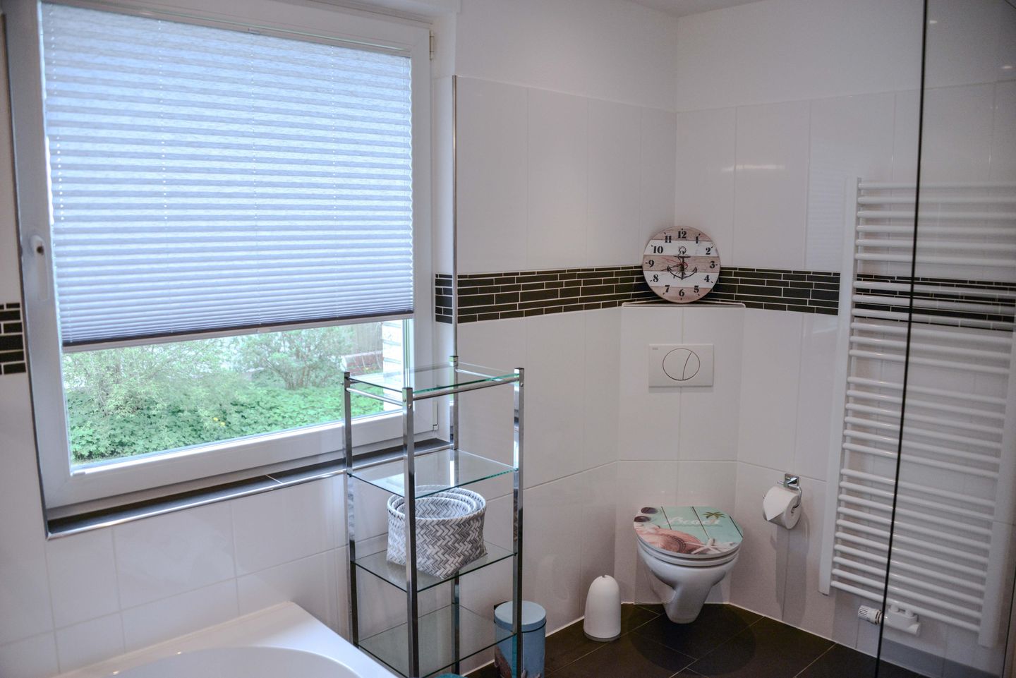 Ein Highlight dieser Unterkunft ist die überdachte Terrasse mit Strandkorb und Blick ins Grüne. Die Gartenmöbel laden zum entspannten Verweilen im Freien ein. Durch den Sichtschutz an allen Fenstern genießen Sie Privatsphäre. Für Familien stehen zwei Hochstühle und zwei Babybetten bereit, sodass auch die Bedürfnisse jüngster Gäste berücksichtigt werden. Ein Gäste-WC ergänzt das komfortable Badezimmerangebot.