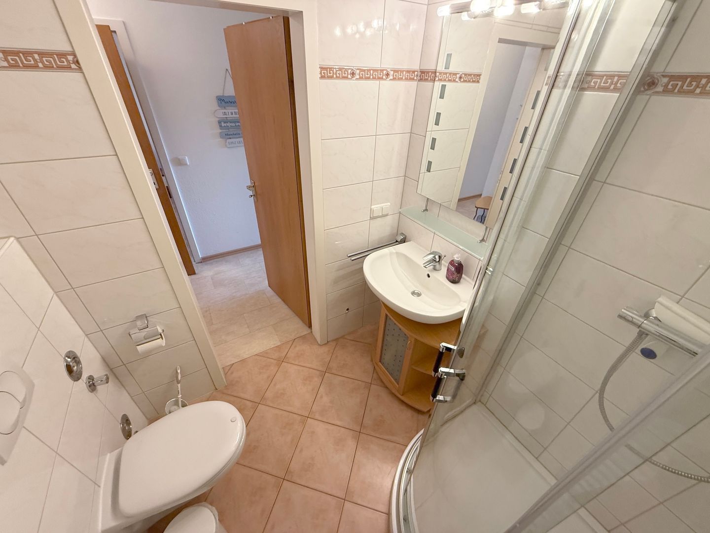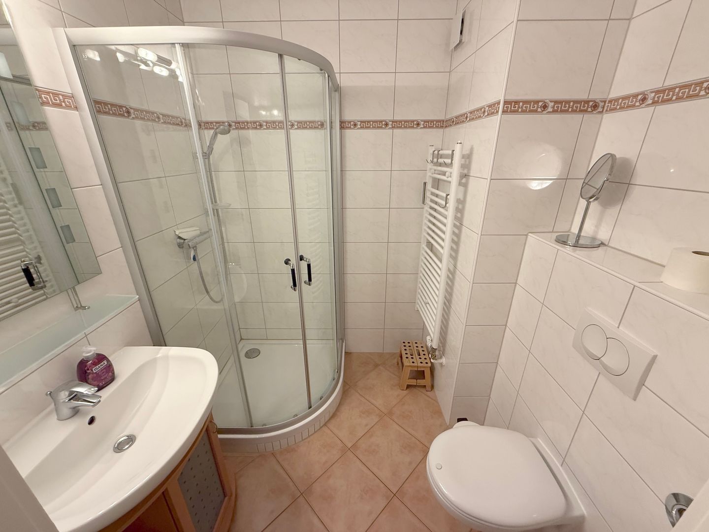 Das hell geflieste Bad bietet Ihnen eine Duschkabine, einen Waschtisch, ein WC und diverse Ablagemöglichkeiten.