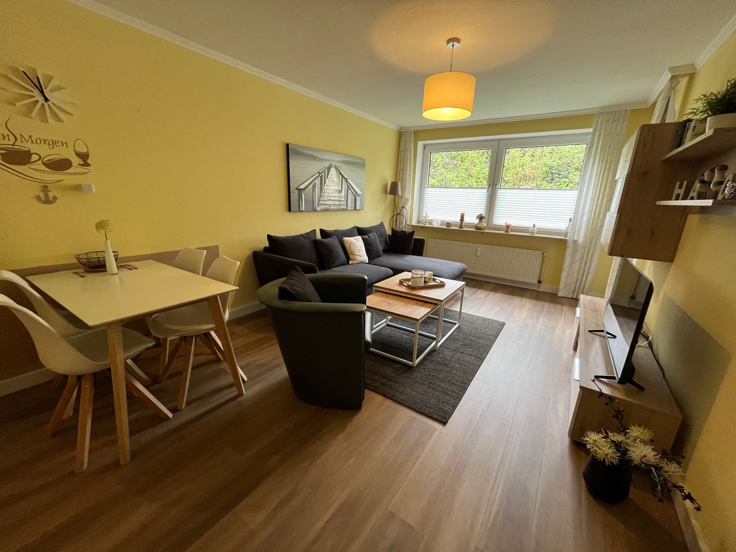 Die Wohnung ist im Wohnzimmer mit einer Schlafcouch und einem Essbereich für 4 Personen ausgestattet.