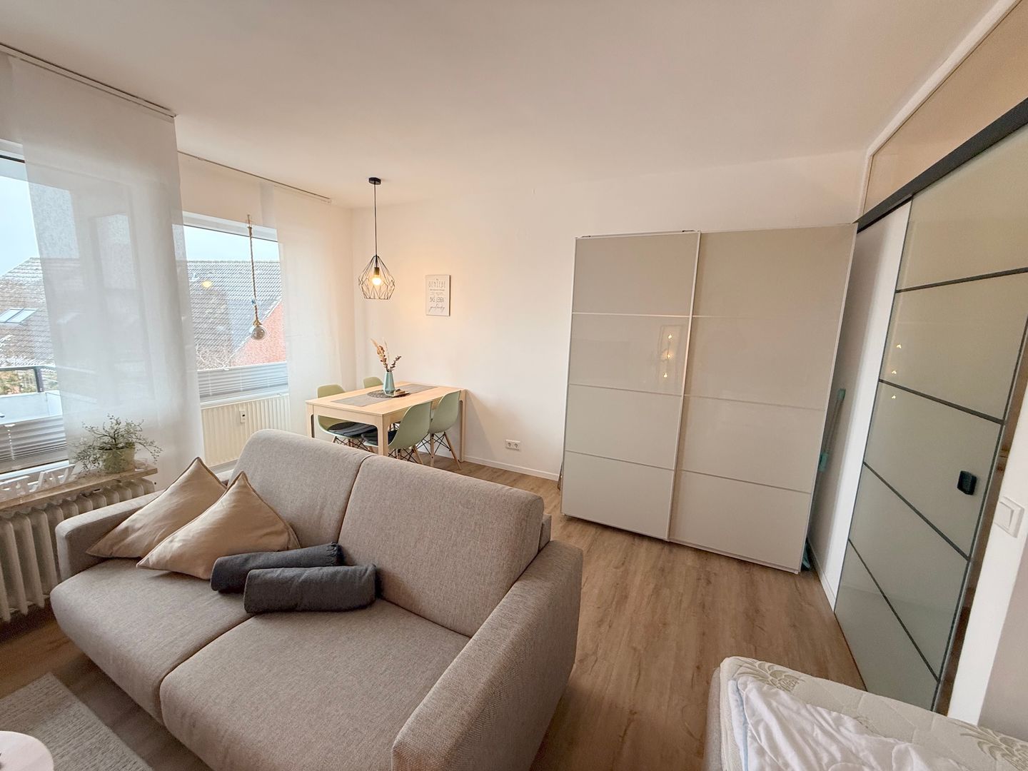 Den kombinierten Wohn- und Schlafbereich erreichen Sie durch den Flur geradeaus an der Küchenzeile vorbei. Auf der linken Seite in einer kleinen Nische erwartet Sie ein komfortables Boxspring-Doppelbett (160x200 cm).