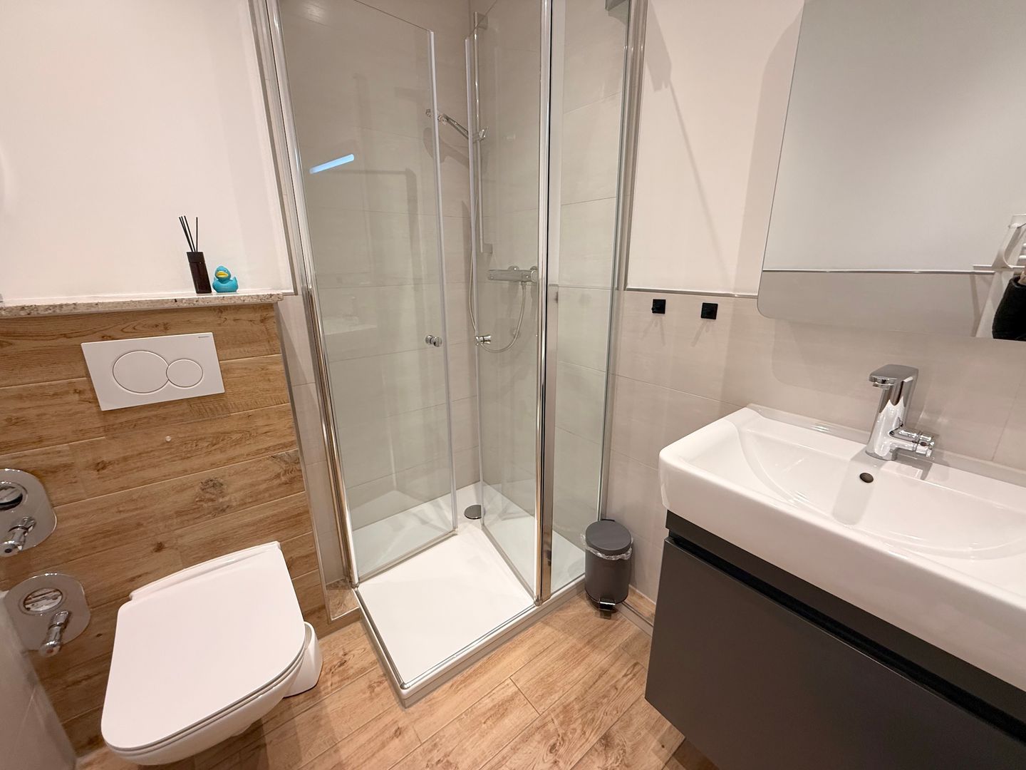 Ein Kleiderschrank für Ihre Urlaubsgarderobe ist ebenfalls vorhanden. Das innenliegende, modern gestaltete Badezimmer verfügt neben einer Dusche z. B. über einen beheizbaren Handtuchhalter.