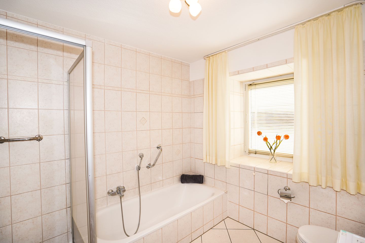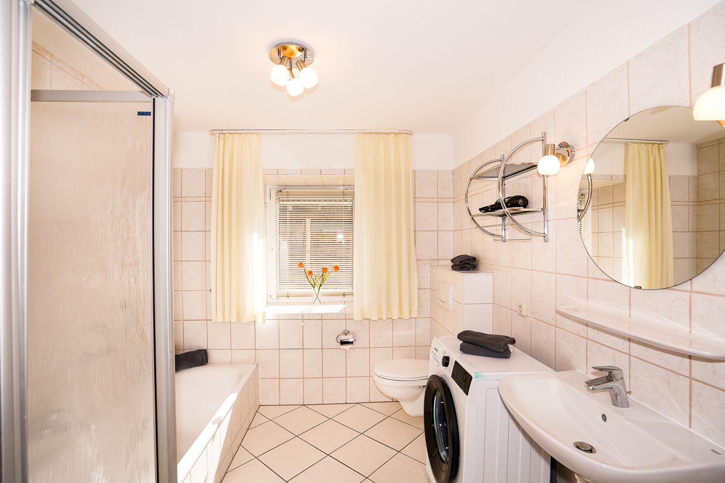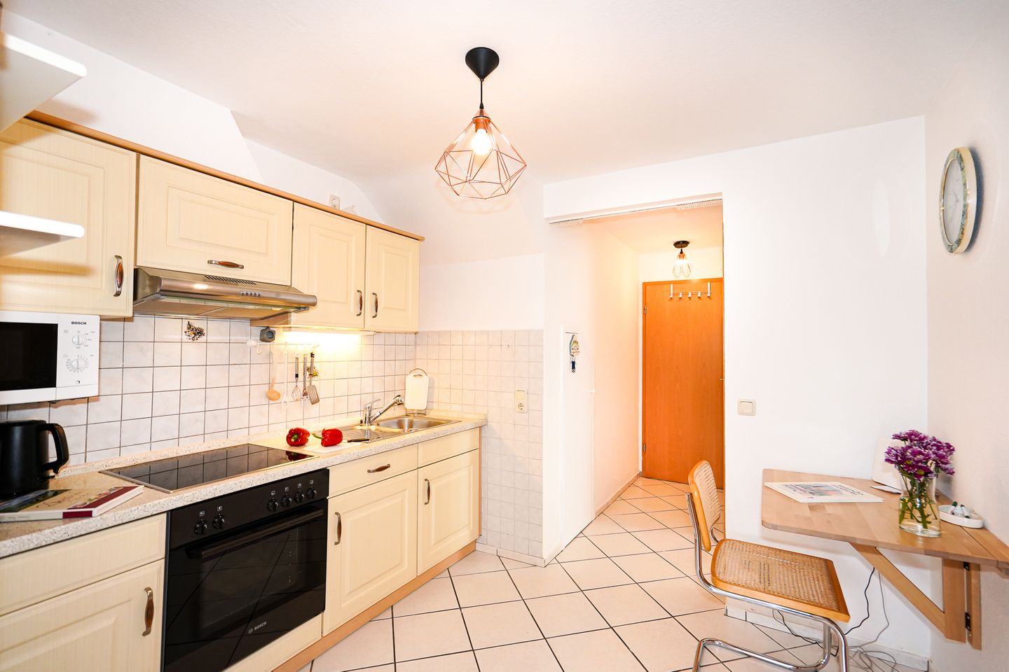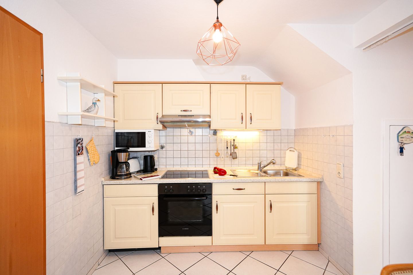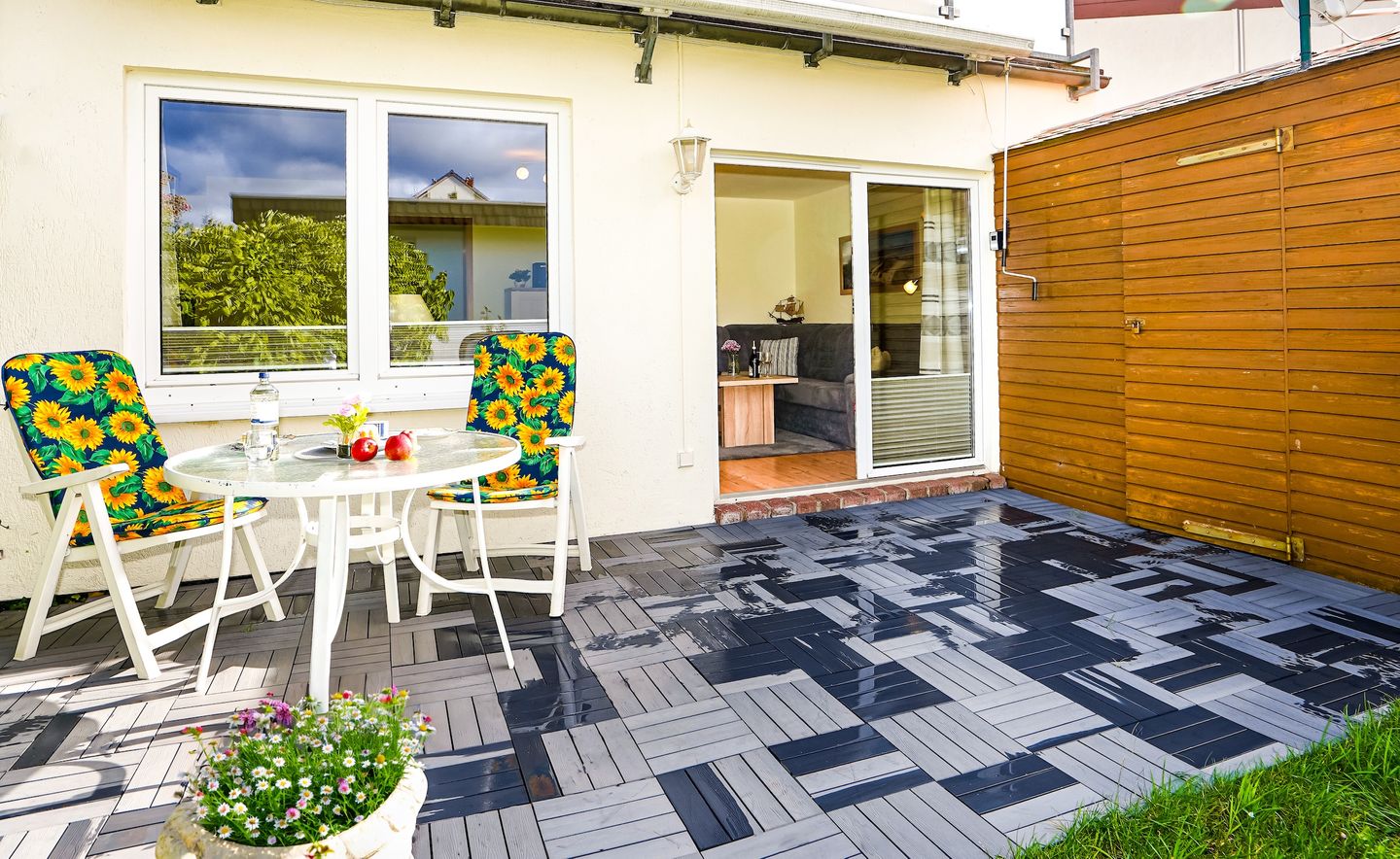 Die Unterkunft ist ausgestattet mit einem gemütlichen Wohnzimmer, voll ausgestatteter separater Küche, Duschbad mit Badewanne, eigener Waschmaschine, Fenster und beheizbarem Handtuchhalter, separatem Schlafzimmer mit komfortablem Doppelbett (2x90x200cm) und geräumigen Kleiderschrank, sowie eigener Terrasse (mit Markise) und kleinem Garten (nicht eingezäunt).