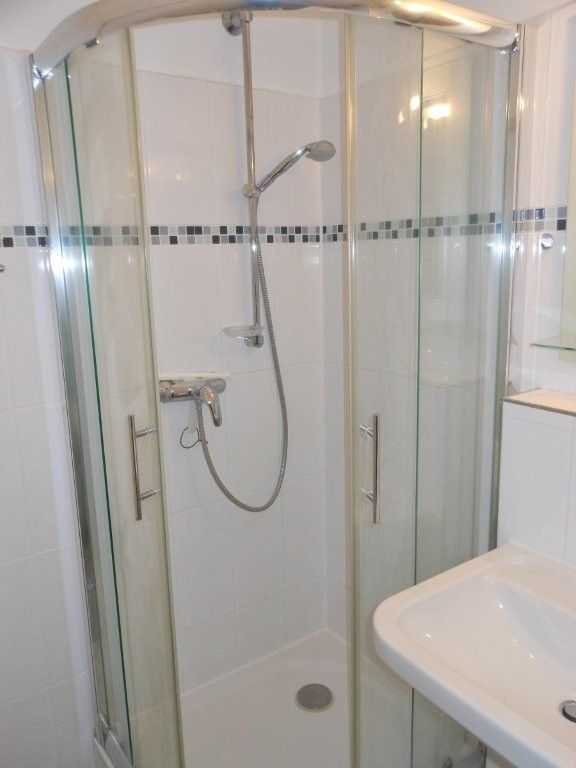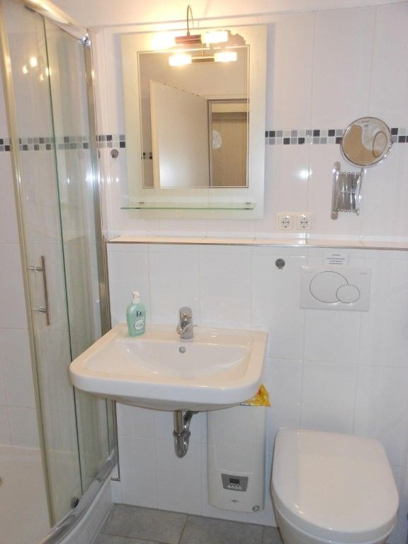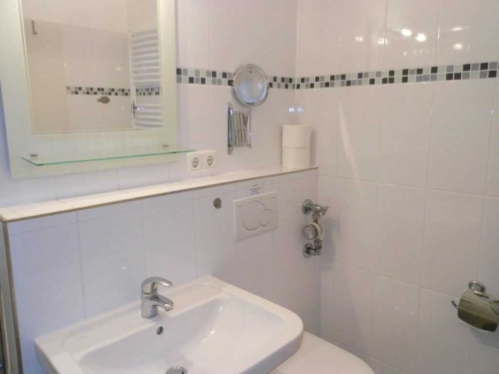Das hell geflieste Duschbad ist mit WC, Haartrockner, Vergrößerungsspiegel und einem Handtuchheizkörper ausgestattet.