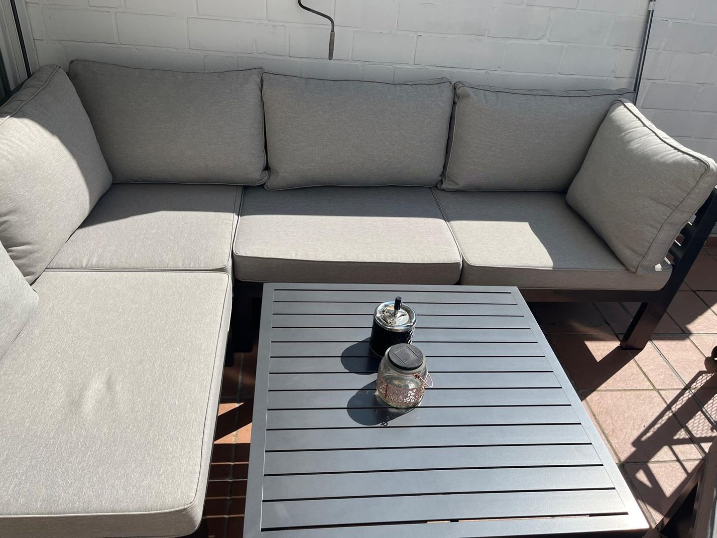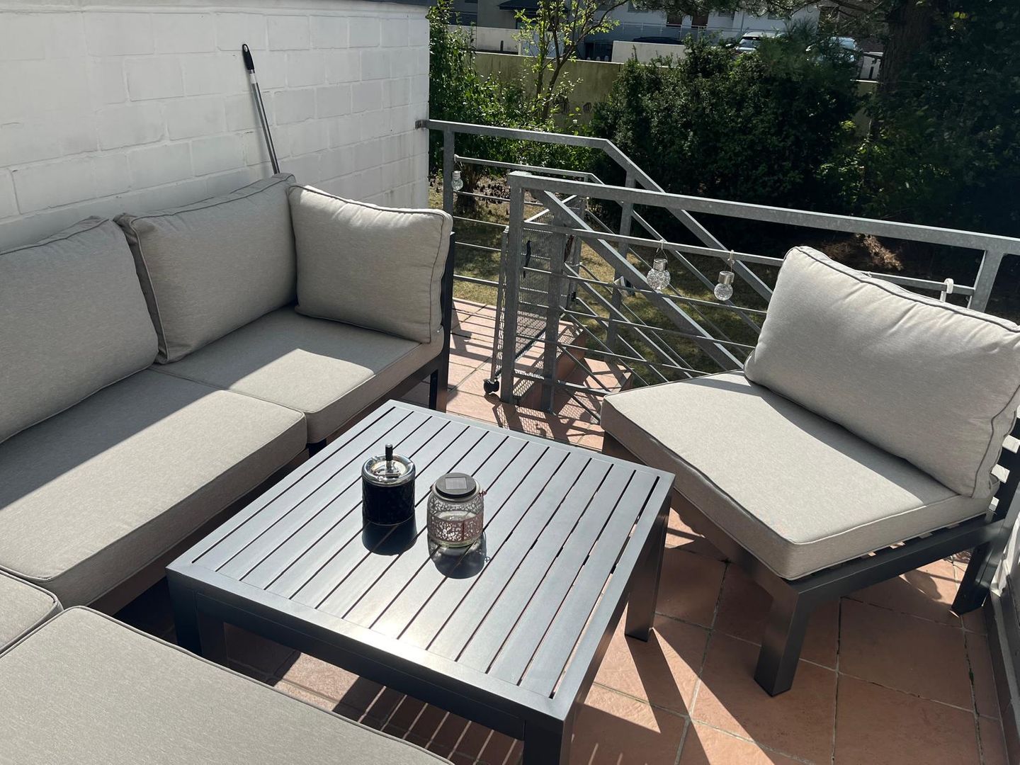 Der Balkon ist mit einer Sonnenmarkise und komfortablen Lounge Möbeln versehen. Eine kleine Treppe führt direkt zum Garten mit kleinem Rasenteil. Ihr Auto parken Sie bequem auf dem zur Wohnung gehörenden Stellplatz unter dem Parkdeck.